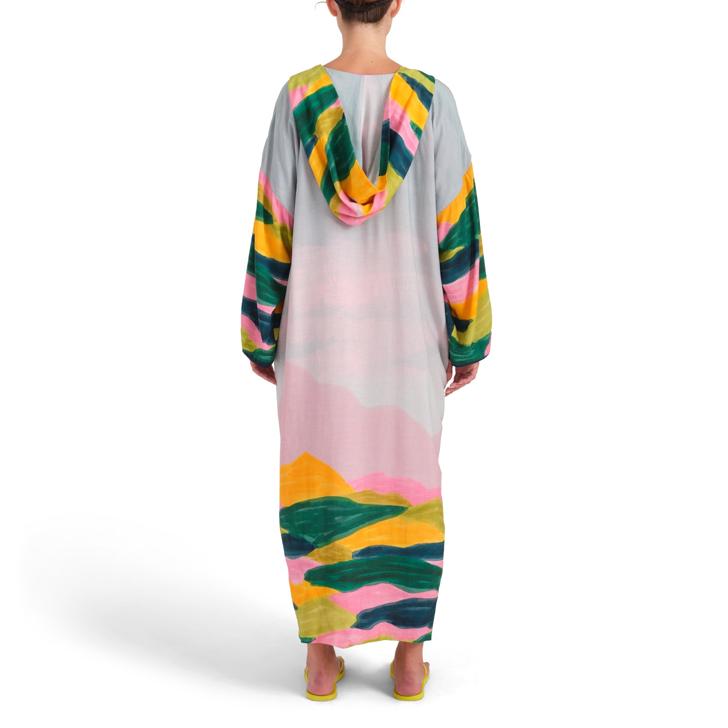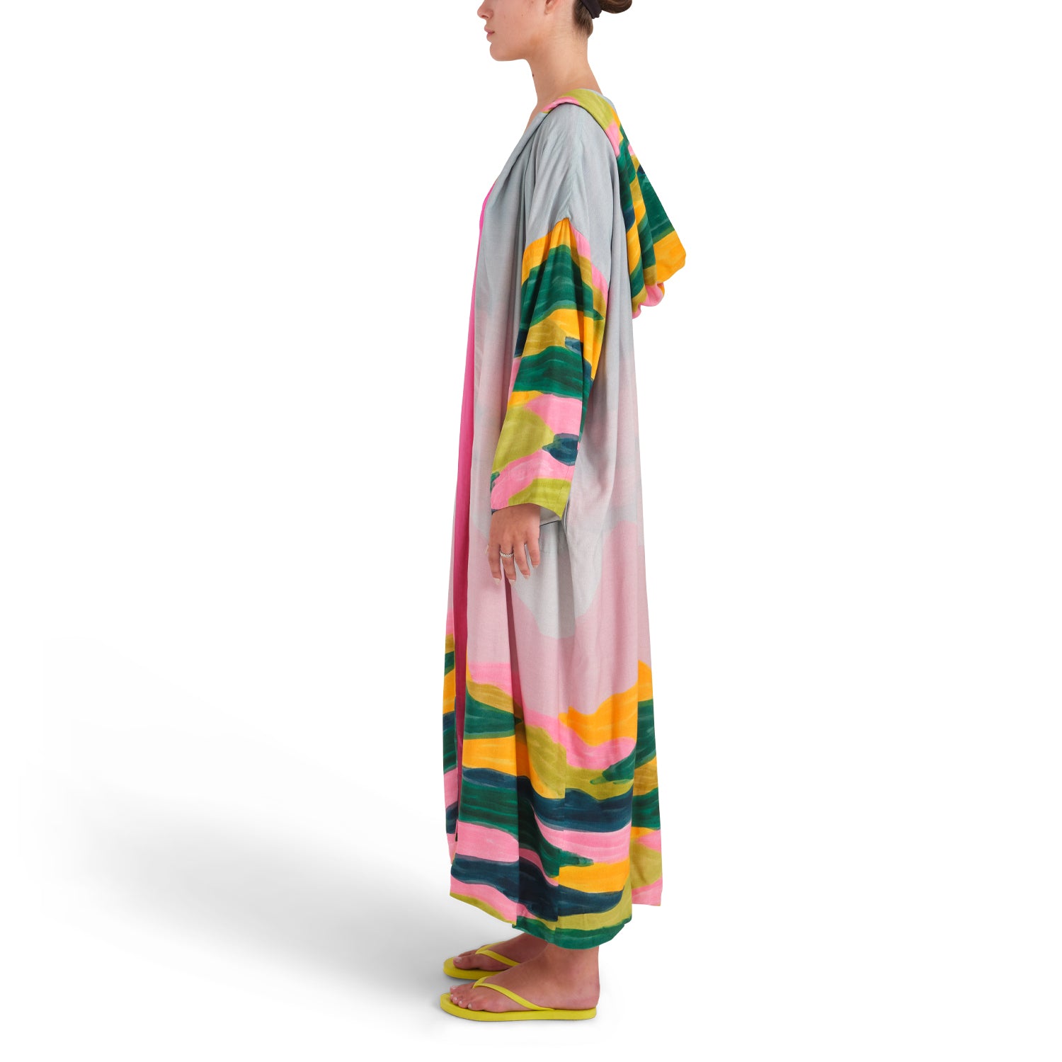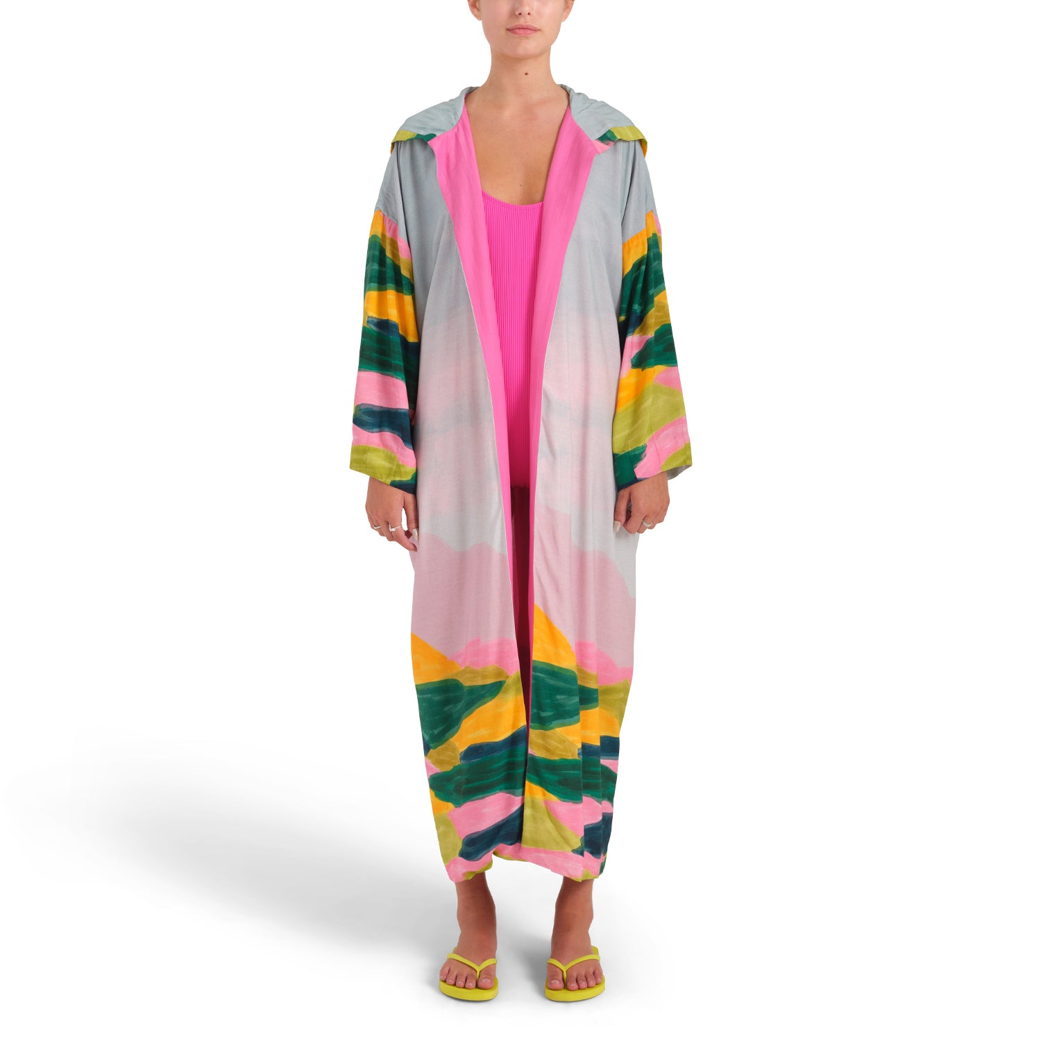 A quiet landscape on a raging colored sea, this bambula (our version of a duster) is crafted from Ecovero (TM) viscose with a brilliant pink lightweight silk and cotton lining. These exquisite fabrics flow with every movement and provide the ultimate in luxurious comfort. Hidden pockets round out the offering. Wear it for a walk on the beach or to wrap up when the sun goes down and you move the adventure to town.