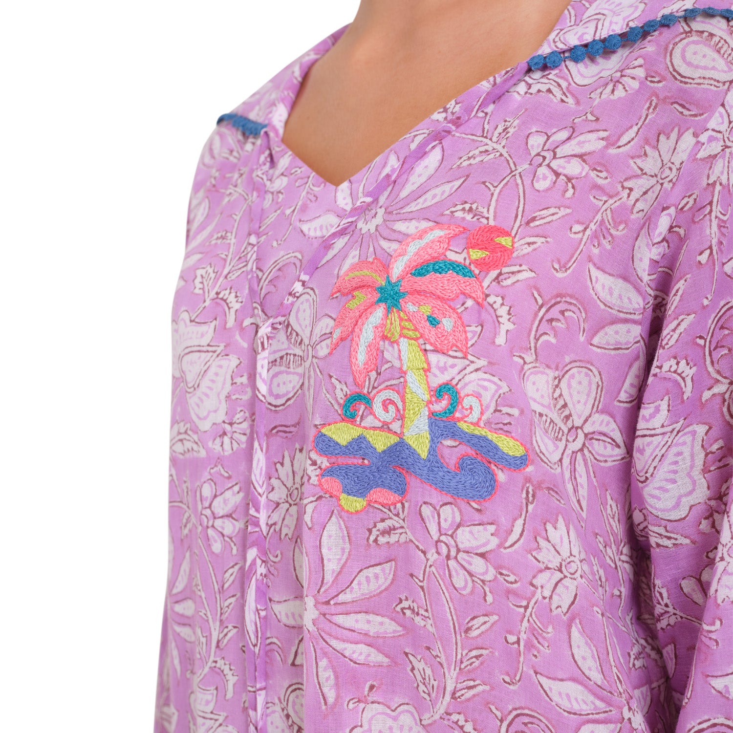 The Diane is hand block printed 100% fine cotton from India and hand embroidered with an exclusive palm tree design. The kaftan was inspired by the clever North African desert nomads who wear lightweight fabric to stay cool and naturally protected from the sun. Their robes/kaftans are often embroidered to represent culture or place. Our embroidery represents our "culture" - a playful palm tree.