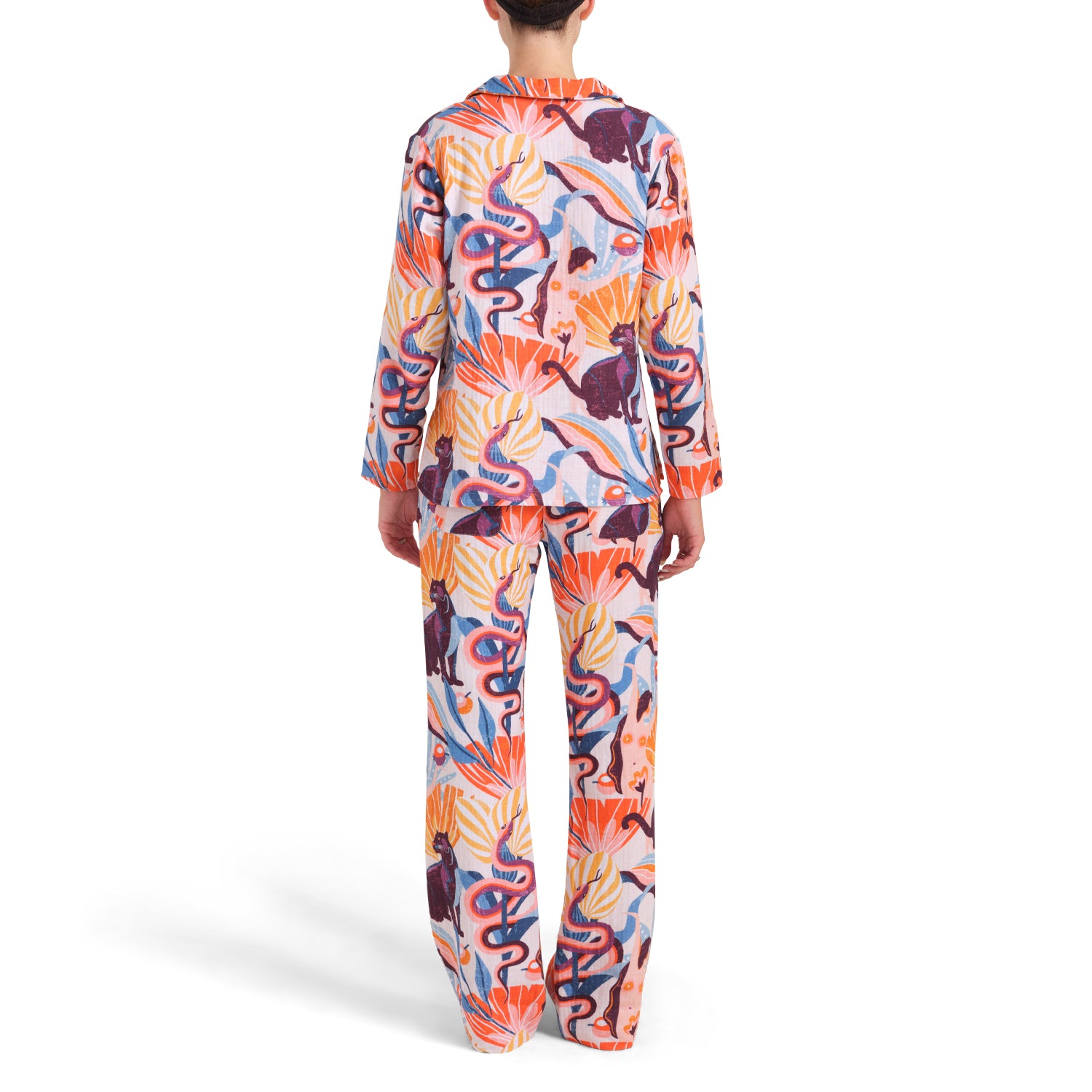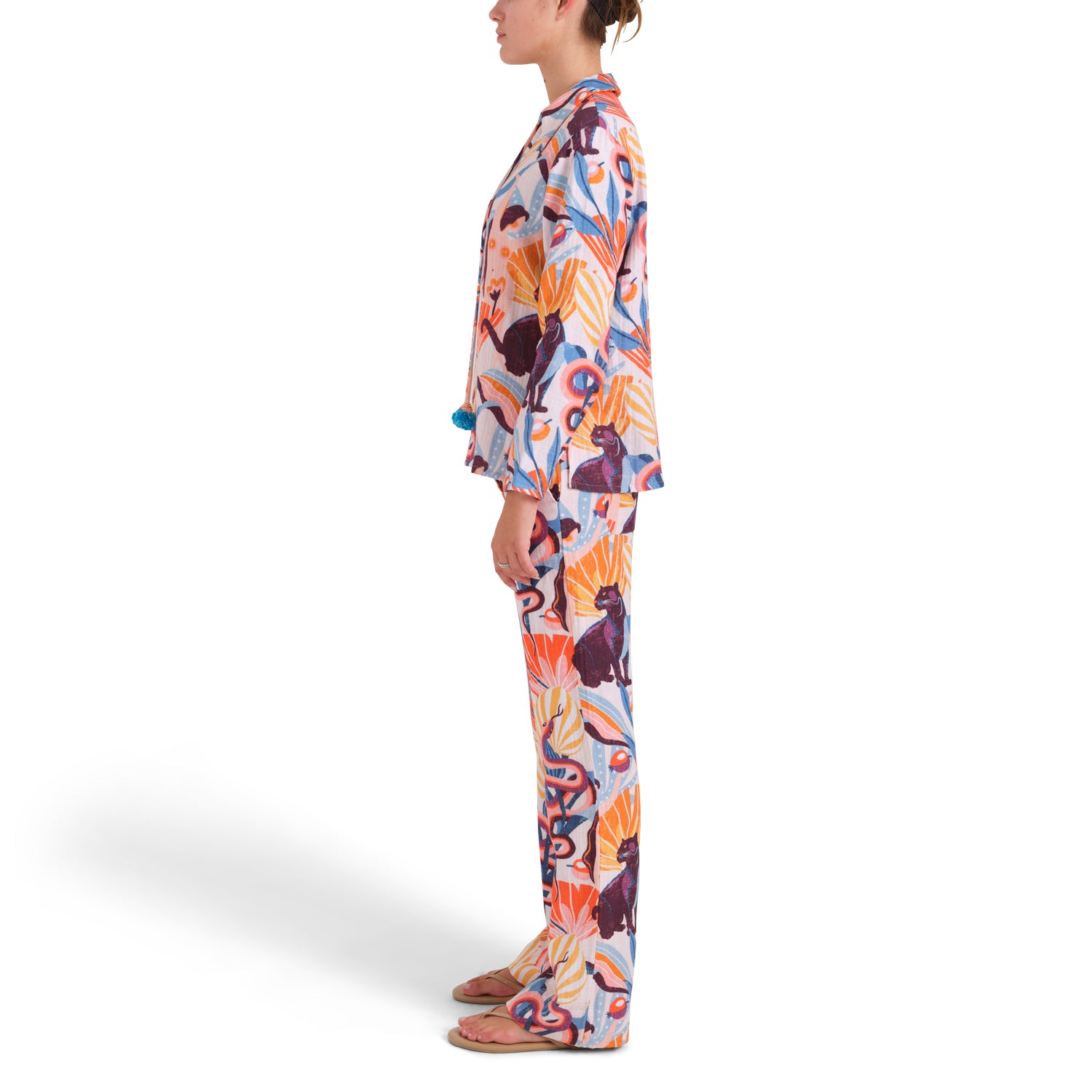 The Judy trousers are an exclusive "Garden of Eden" design printed on environmentally considerate, incredibly soft 100% BCI (Better Cotton Initiativeâ„¢) triple cotton gauze from Italy. Coconut buttons add an extra splash of tropical feels.