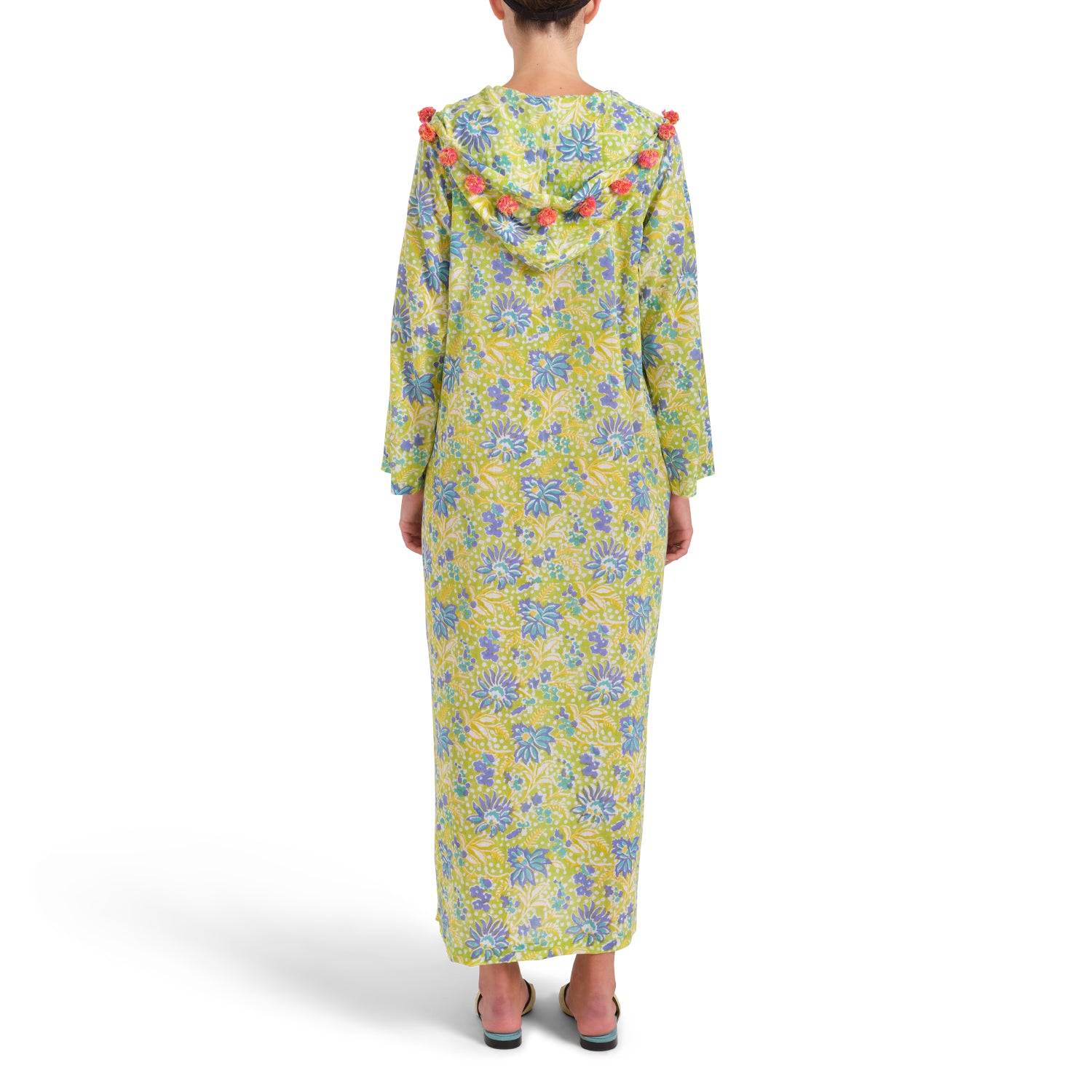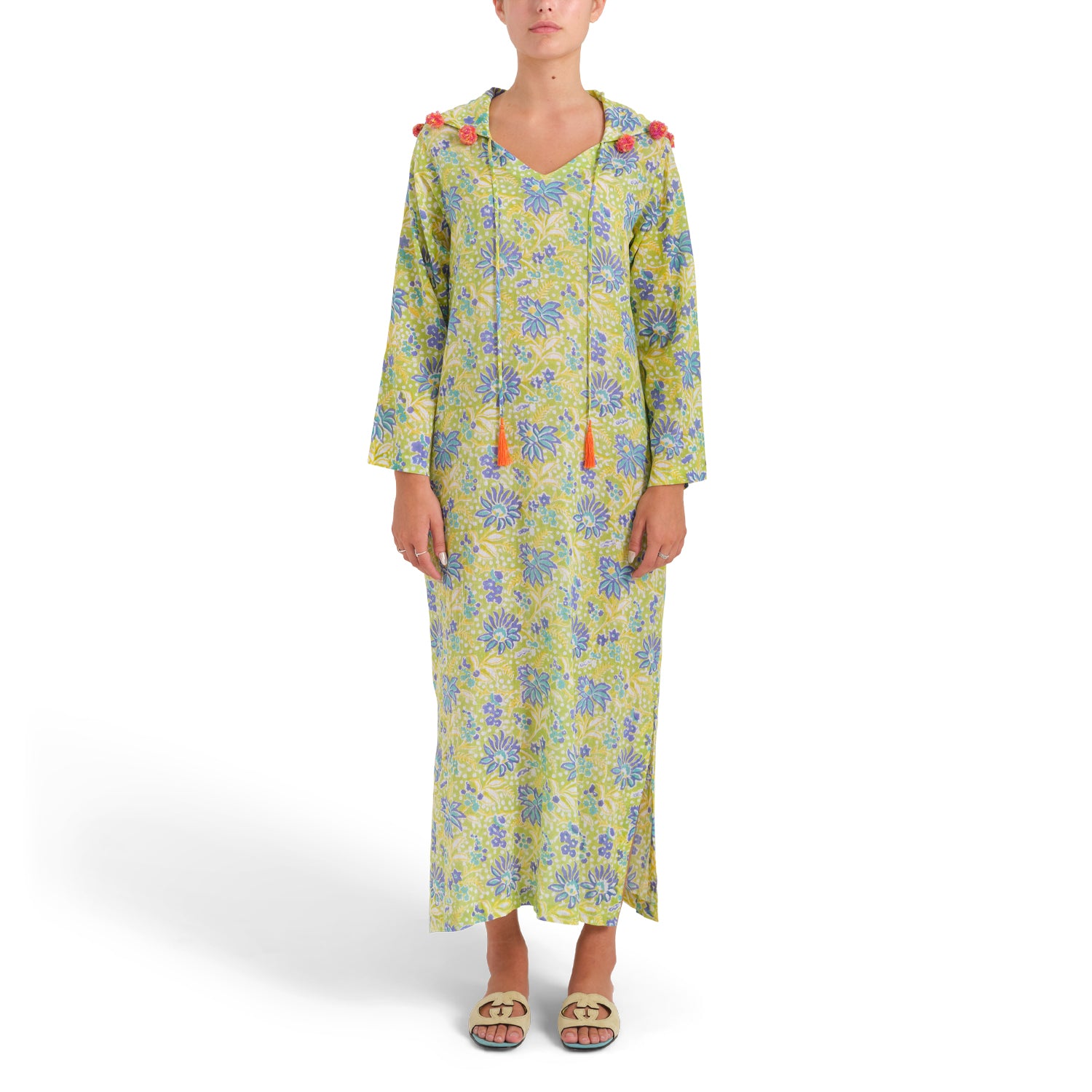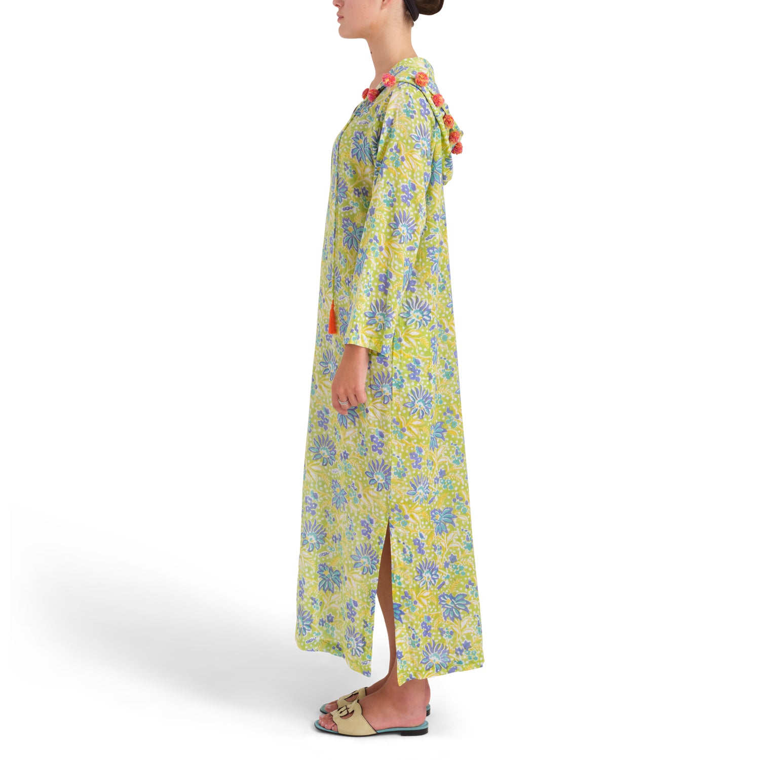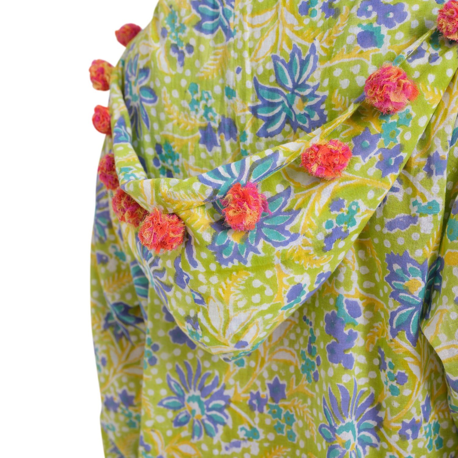 The June kaftan is hand block printed 100% fine cotton from India and hand embroidered inspired by the clever North African desert nomads who wear lightweight fabric to stay cool and naturally protected from the sun. The use of handmade vintage recycled silk pompoms adds a playful, artful and environmentally considerate touch