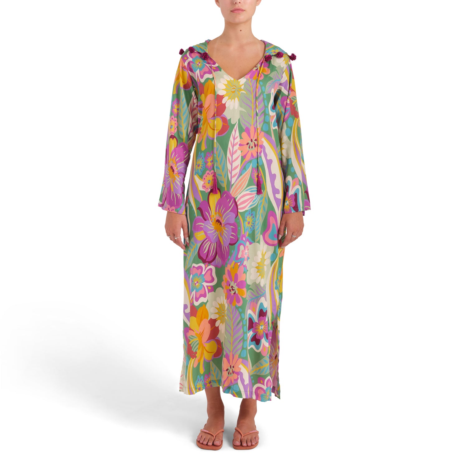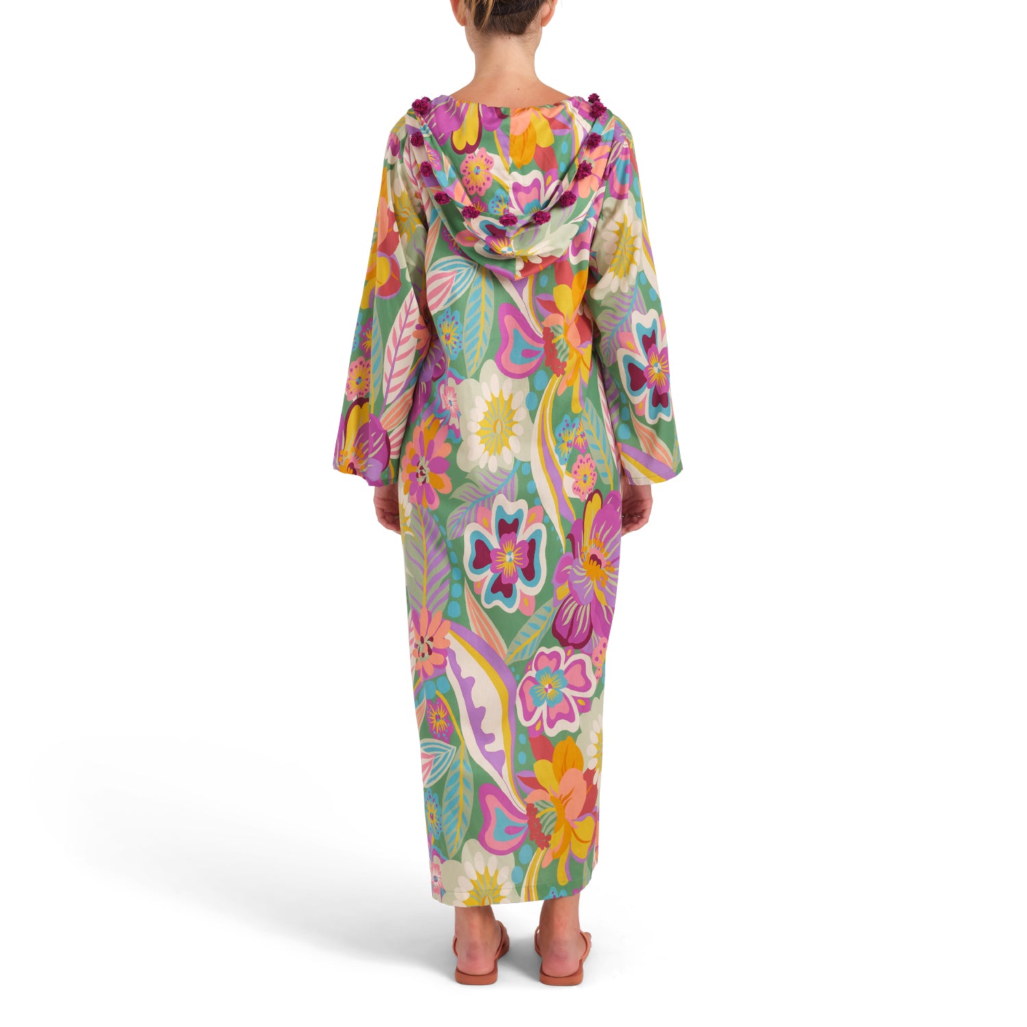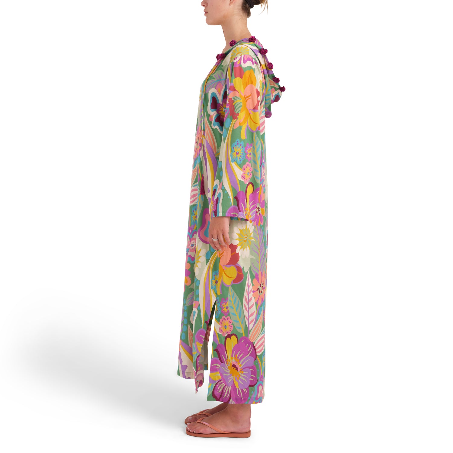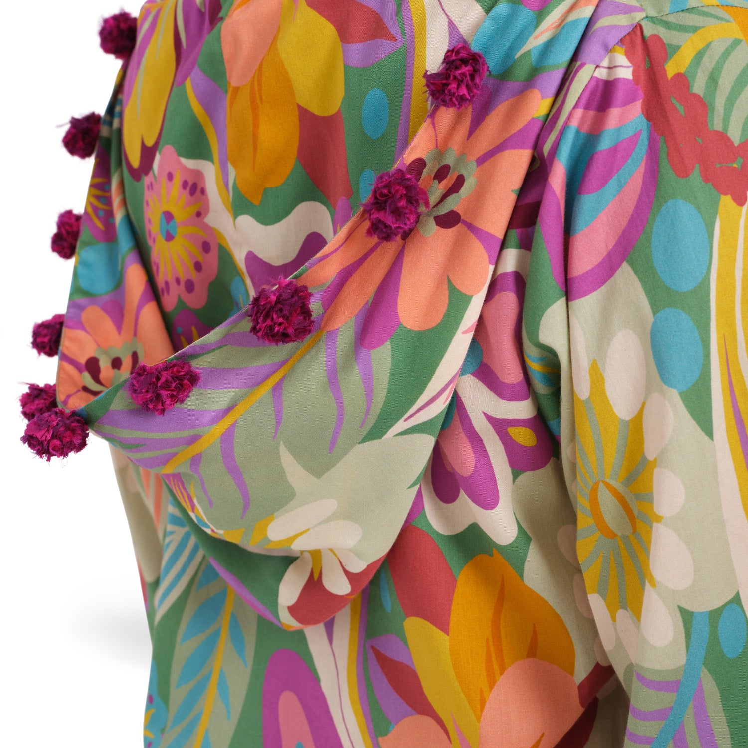 The world of Tigers and Monkeys collide in this lightweight 100% cotton floral from Italy spiced up with handworked upcycled vintage silk pom poms. Elegant Deep V-neck and more fitted body like our silk kaftans. Go quiet (if you want to) on the rest of your gear to and let this piece take center stage. And yes we have hidden pockets for added functionality.