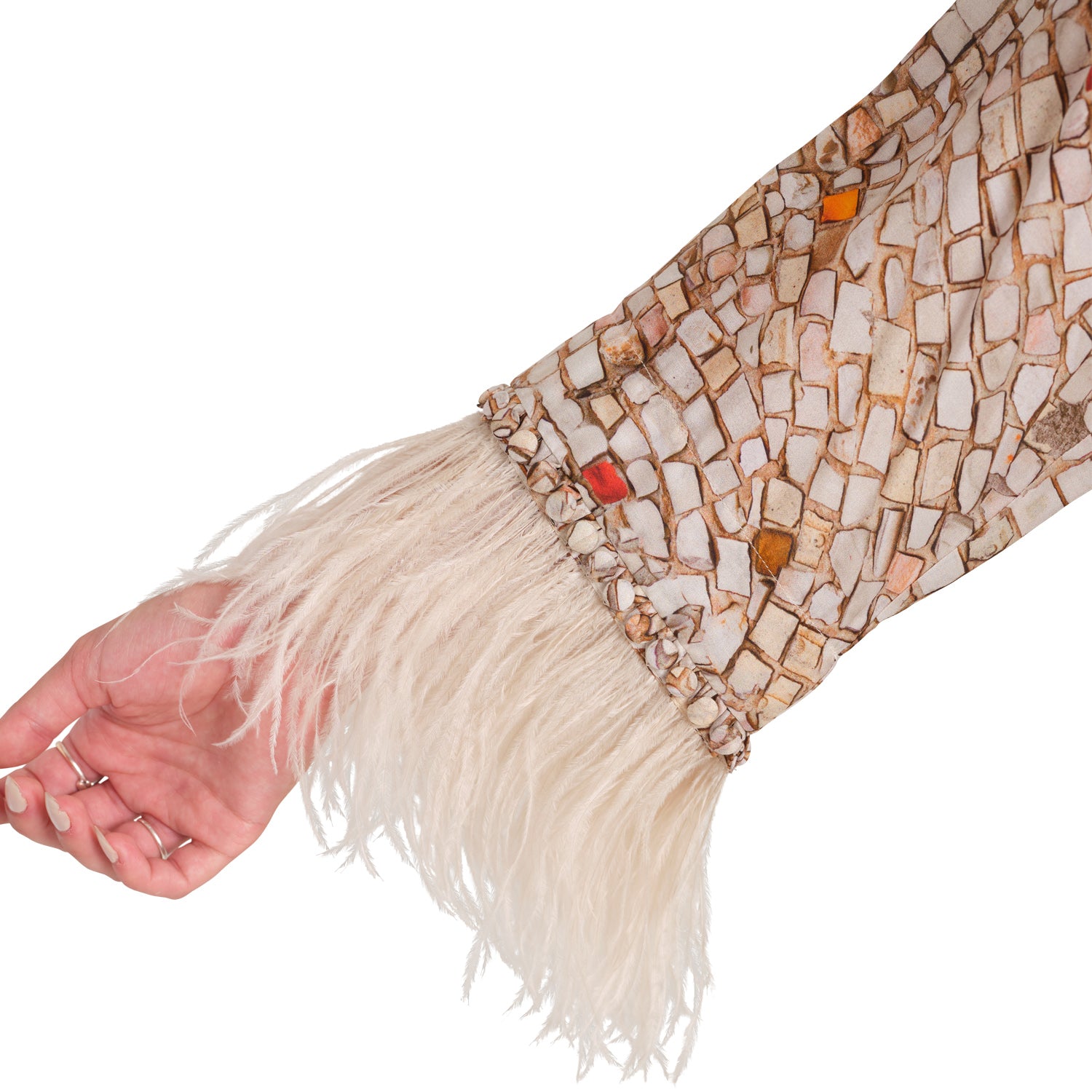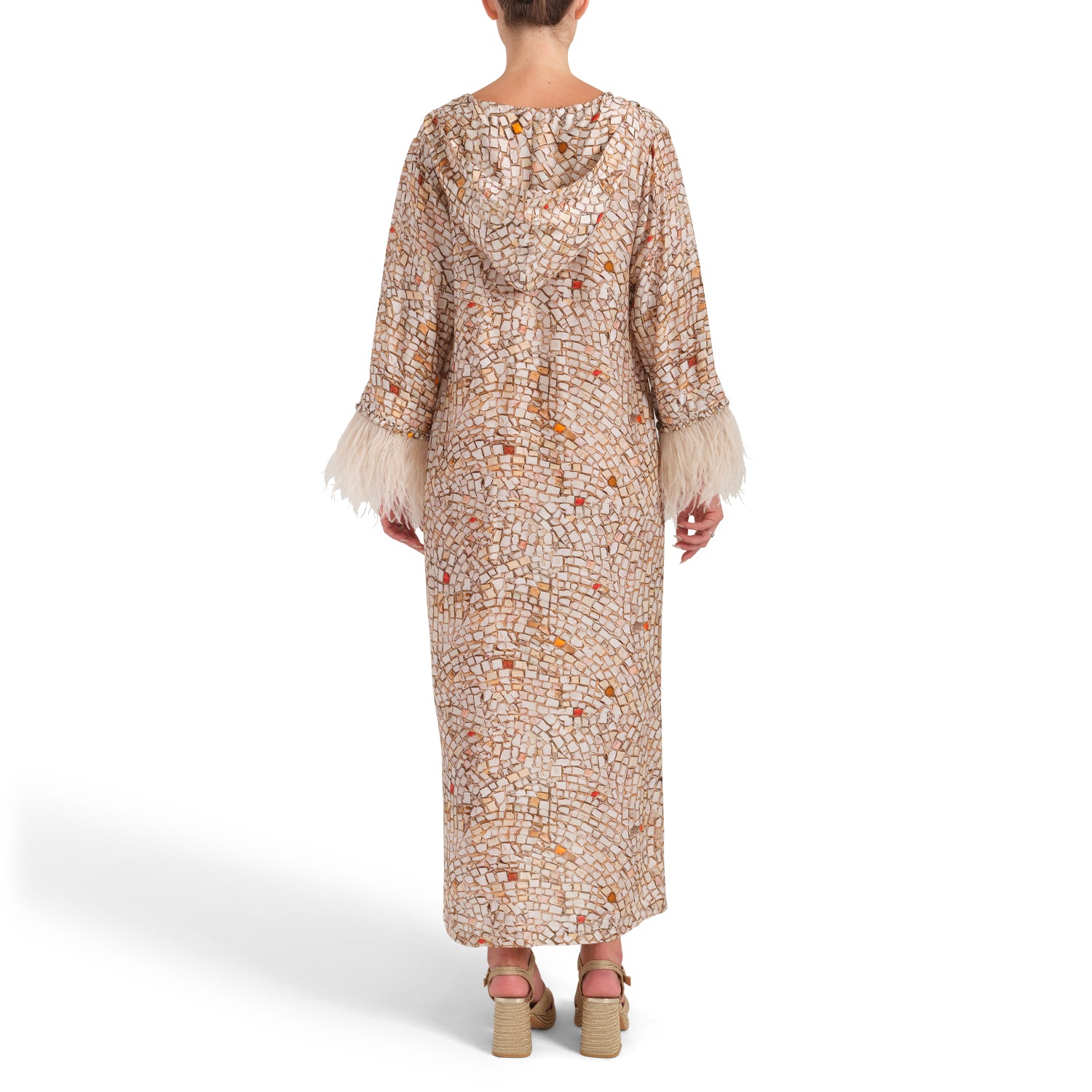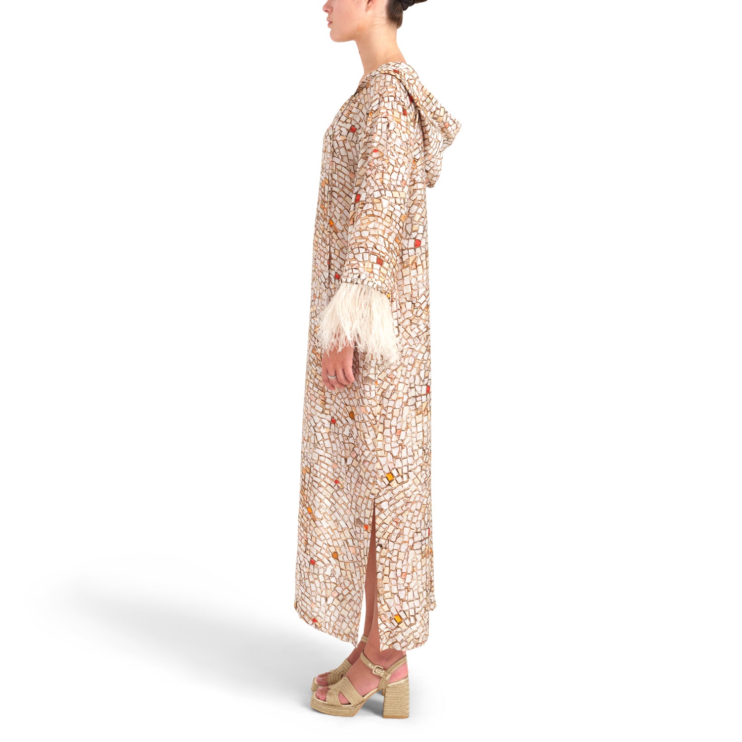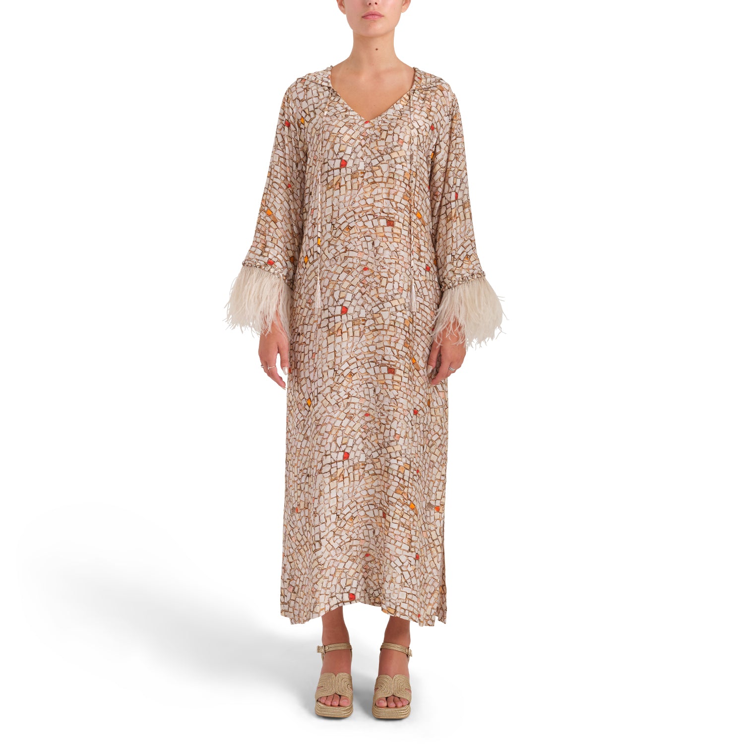 Our Milena mosaic kaftan is stunningly neutral, elegant, comfortable and perfect for an evening out. Dress Milena up with the feathers for a statement look or remove the feathers to reveal the unique sleeve detailing that sings on its own. She's crafted from a very lightweight breathable silk/viscose blend that moves with every step and has a deep V neck and a slightly curvier body than our cotton kaftans. Milena's treasure is the hidden pockets that make her the epitome of luxury comfort.