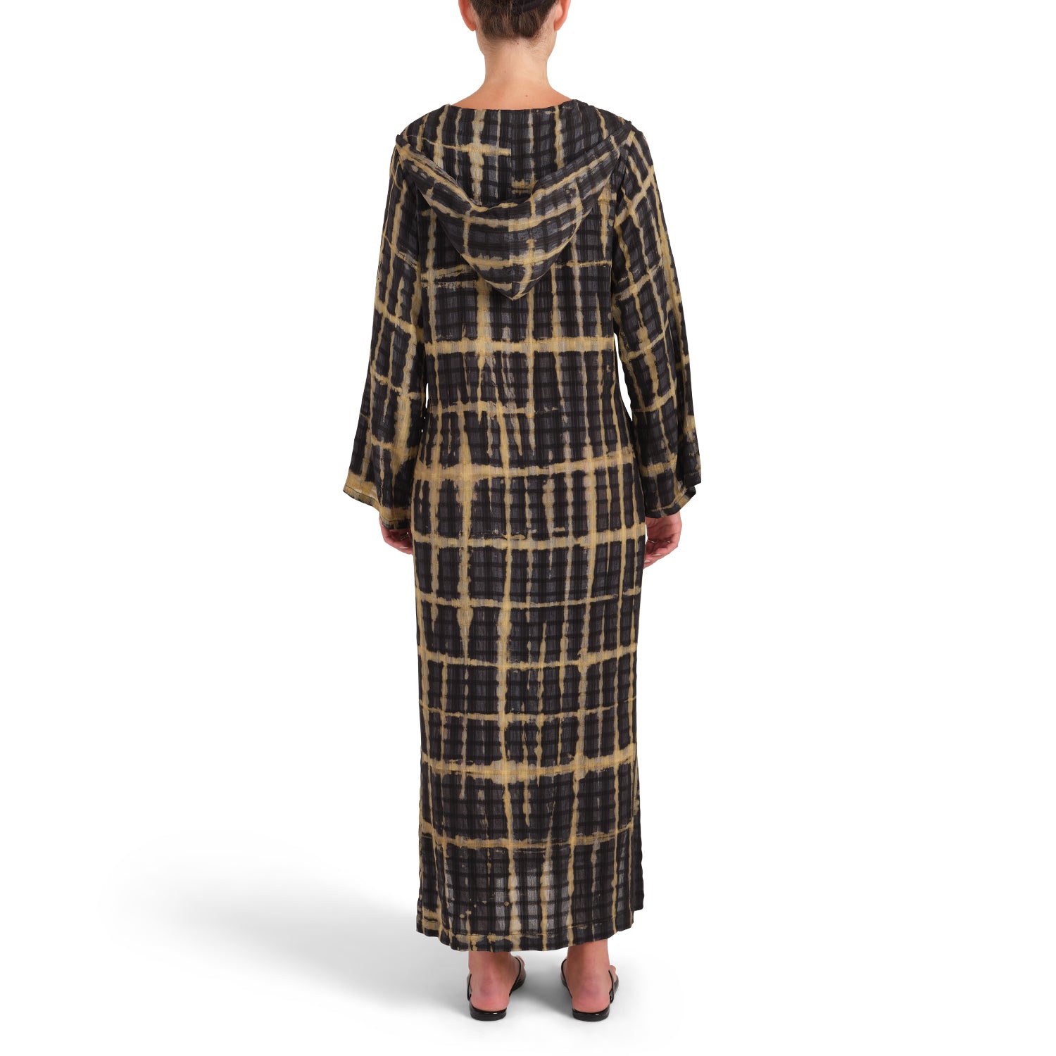 The Regina kaftan is made with 100% organic three textured hand loomed silk. Handworked shibori design and 100% vegetable dye from an award-winning business focused on the art of vegetable dyes, hand worked shibori, and organic fabrics.