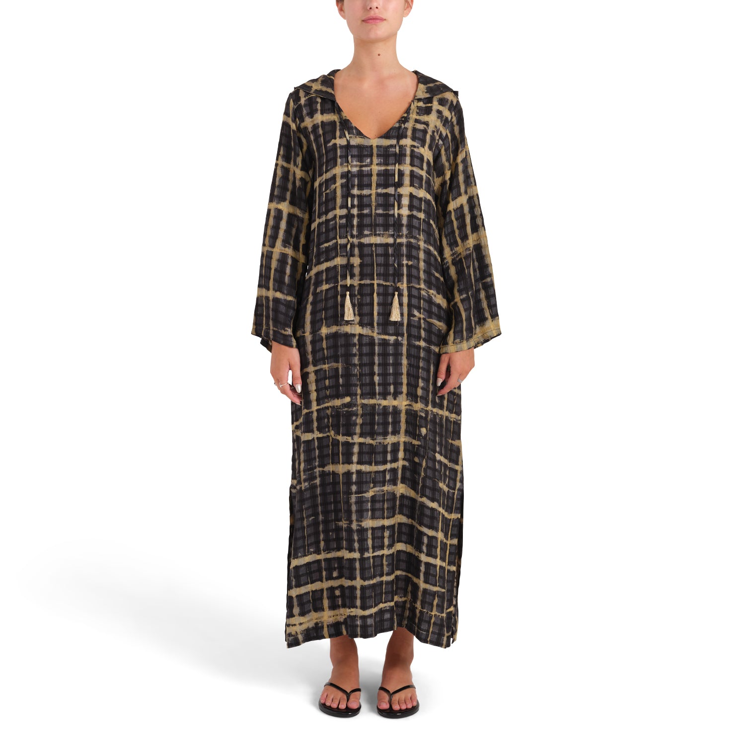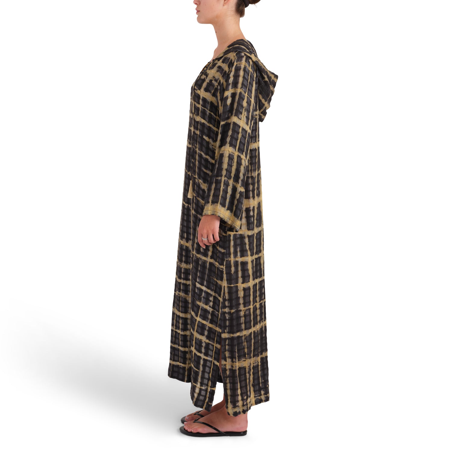 The Regina kaftan is the original "Tiger". A stunning hand worked shibori pattern dyed in 100% vegetable dye and crafted with three different textures of hand loomed silk, this medium weight kaftan delivers a unique sense of beauty and elegance. Regina was designed with a deep V neck and a slightly curvier body than our cotton kaftans and has simple silk tassels which can be tied or left free to flow with every movement. Due to the 100% handmade nature of the fabric, no two pieces are alike.