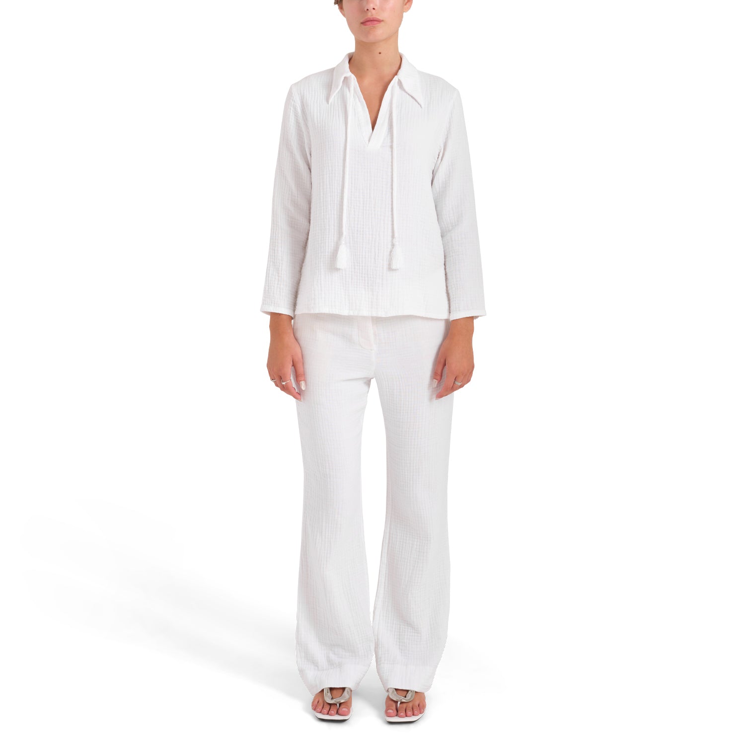 The Debbie In Law drawstring pant with hidden front pockets (and cute back pockets...) provides the ultimate in comfort, ease, and versatility. Made from incredibly soft, environmentally considerate 100% BCI (Better Cotton Initiative™) triple cotton gauze from Italy, wear these pants with your swimsuit to the beach, with a T shirt and a duster for almost any adventure, or match it with one of our 70s-inspired shirts, The Claire or the Donna. Drawstring is finished with a white silk tassel and unlike alot of white pants/trousers, the front pockets are beige so they "hide"!