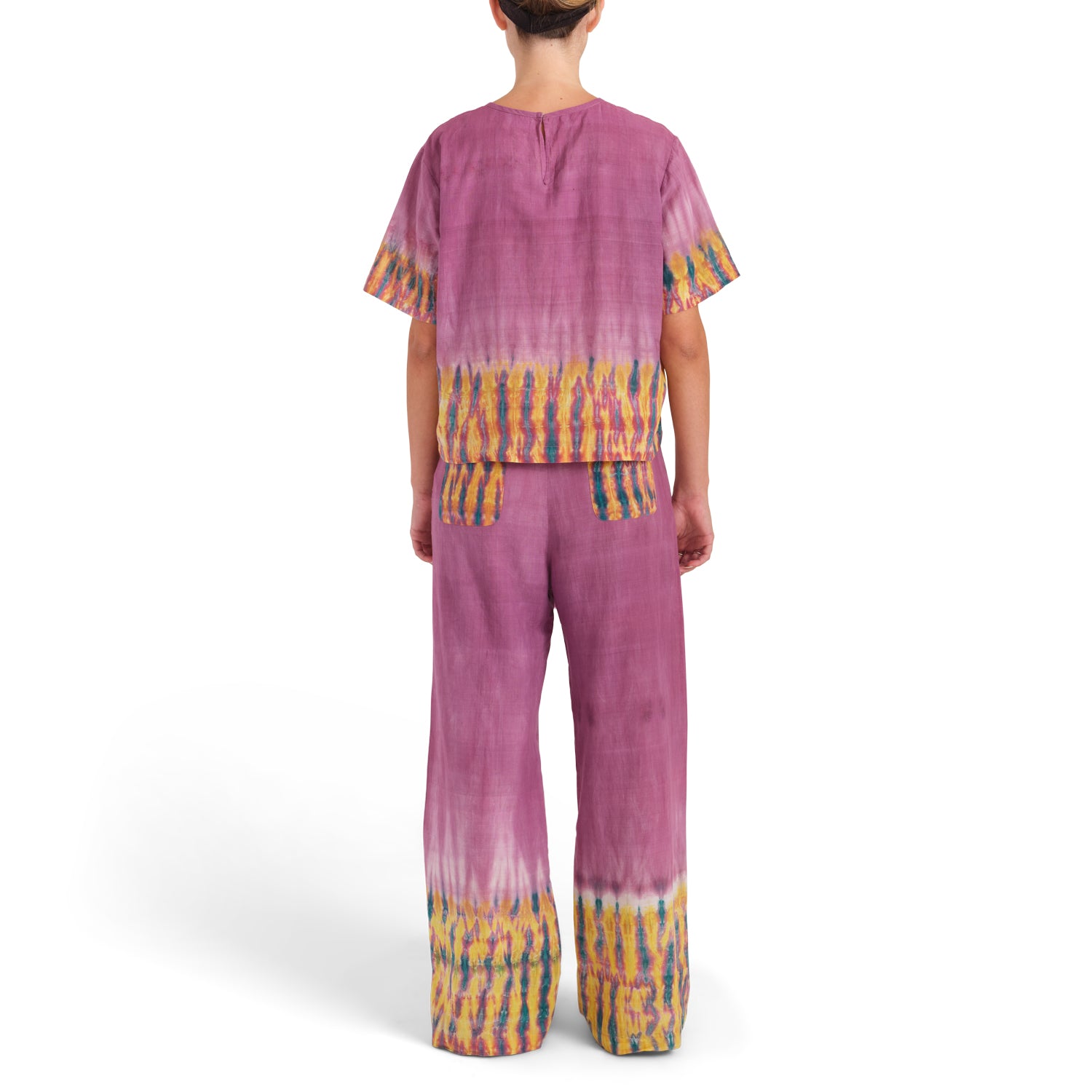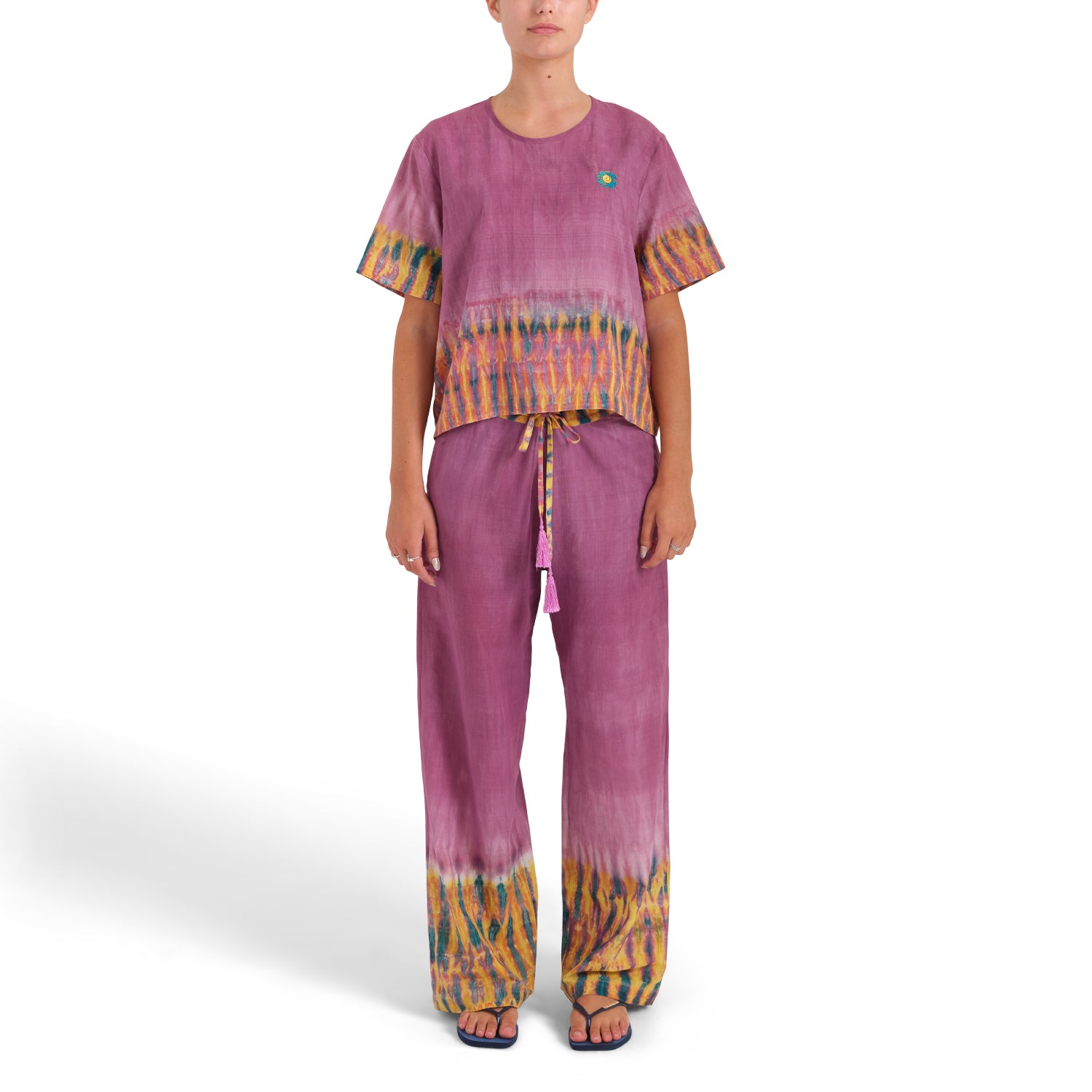 100% handloomed organic cotton, handworked shibori design. Drawstring waist with silk tassels