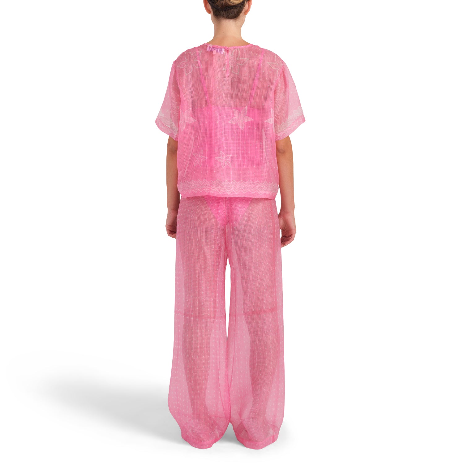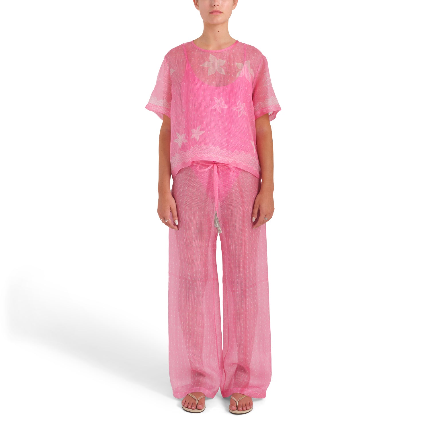Gina's beauty is her delicate simplicity. Designed as a slightly boxy T-shirt, she pairs well over a basic or pretty bra, bikini top, camisole or regular t-shirt - wear it as you like!! Her fabric is completely handworked by our artisans- making Gina truly one of a kind. The hidden back neckline closure makes her an ease to put on and take off. Style Gina with the matching Jane Marie pant, our white gauze Debbie In-Law pant or style her your way! This garment is crafted from hand loomed, hand printed, hand stitched, hand dyed fabric. Variations in color, design and texture are part of its beauty and are not considered a design flaw.