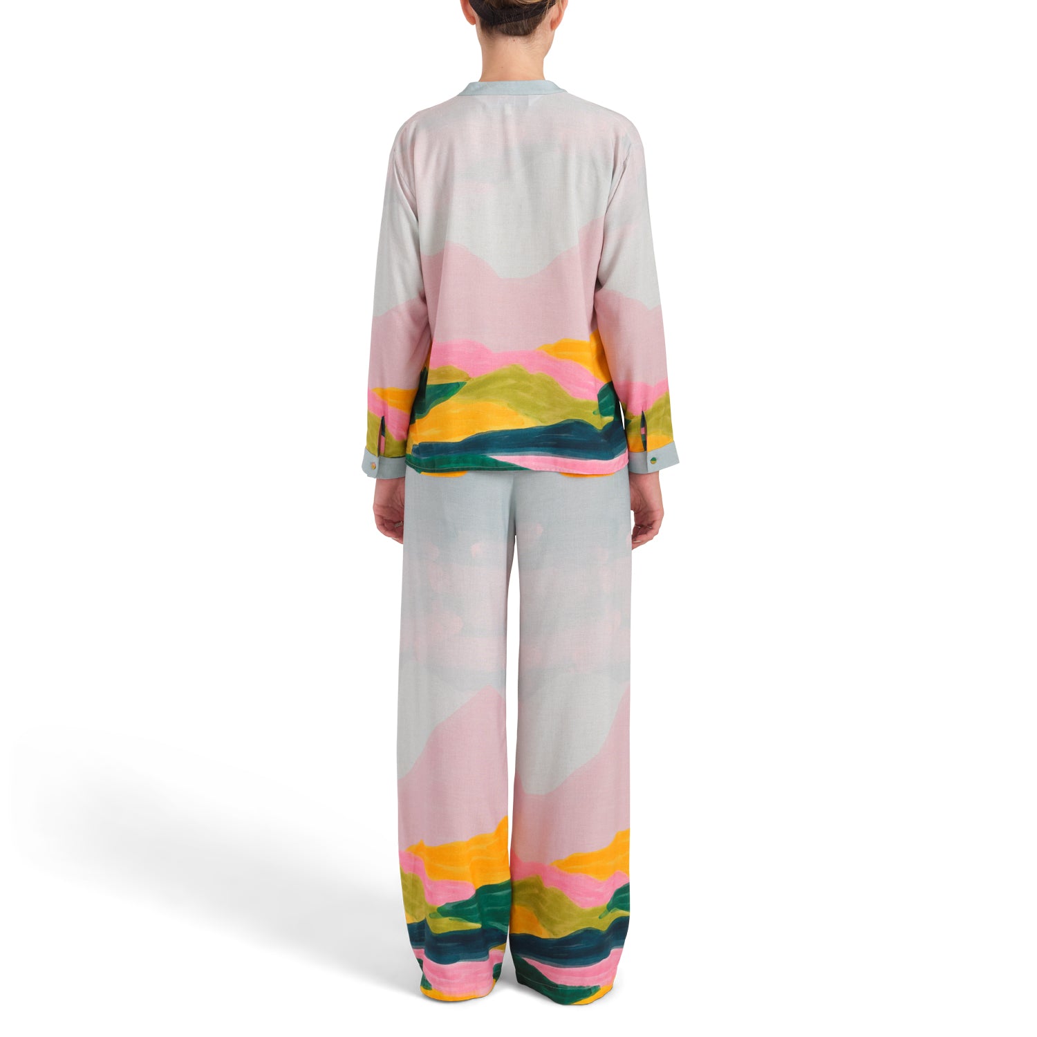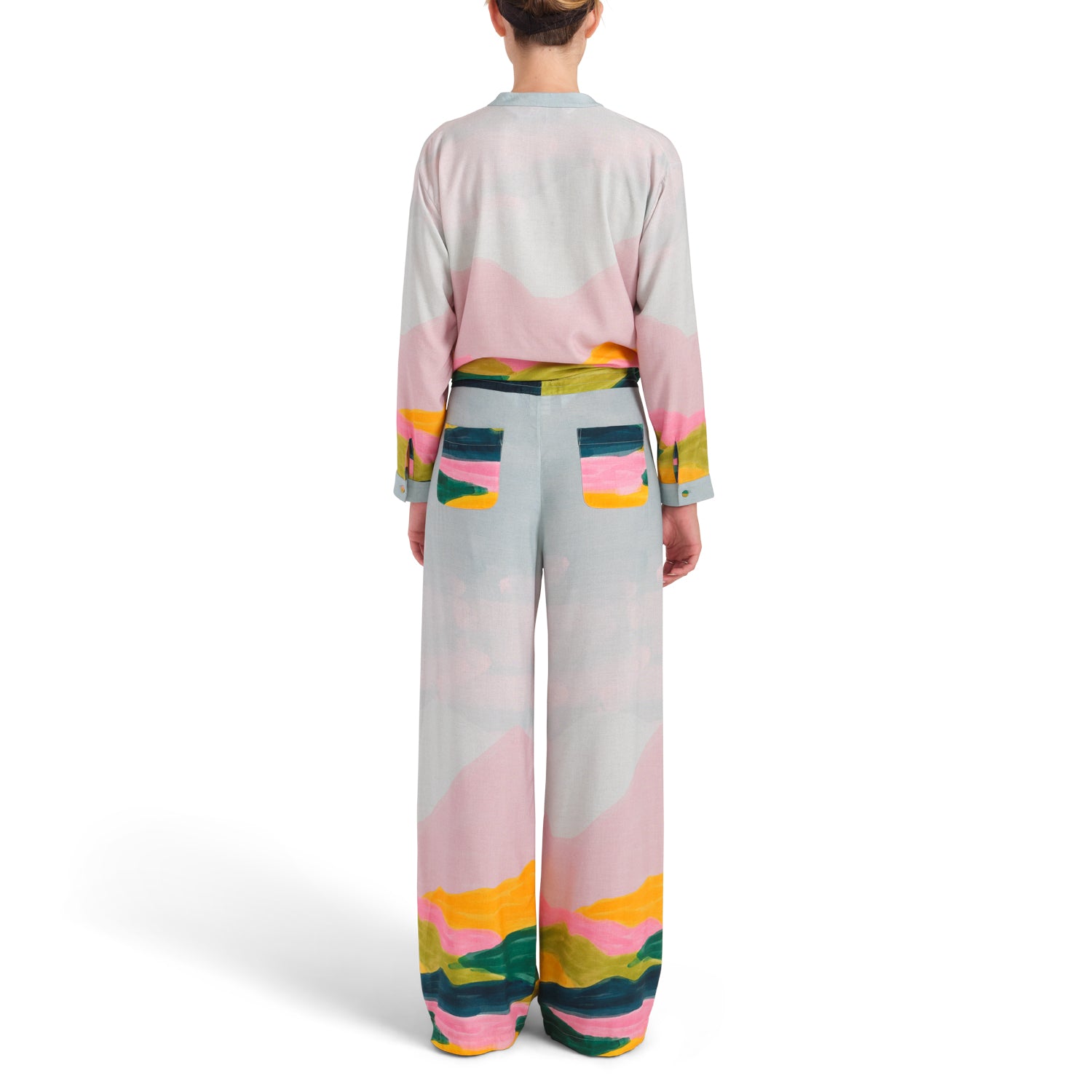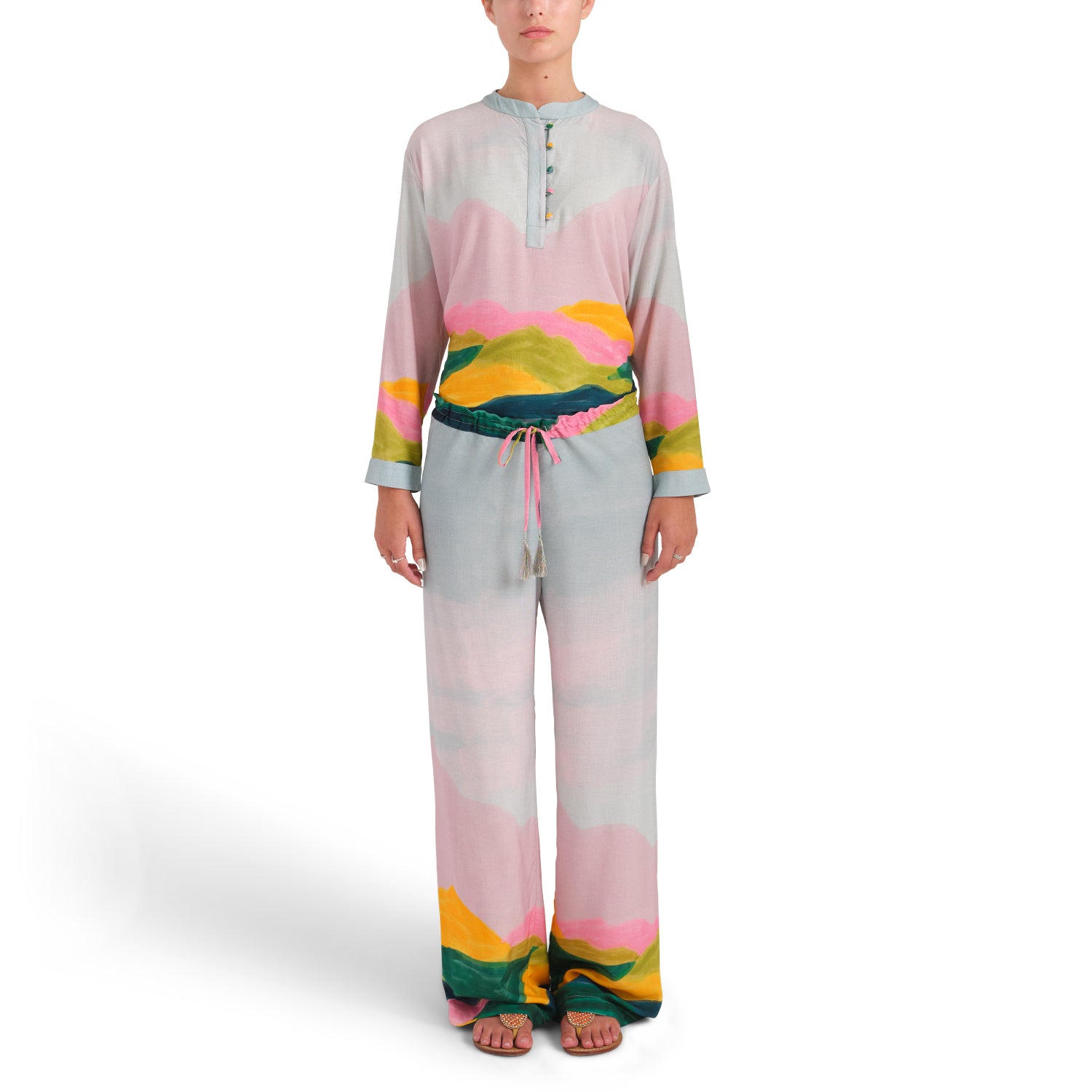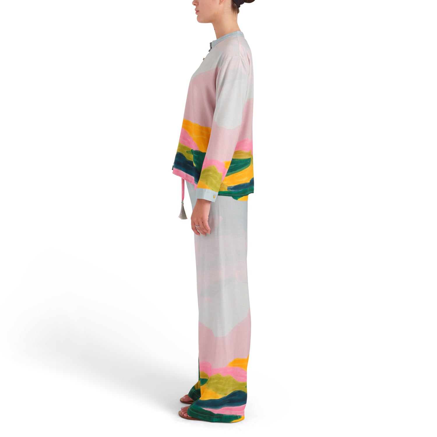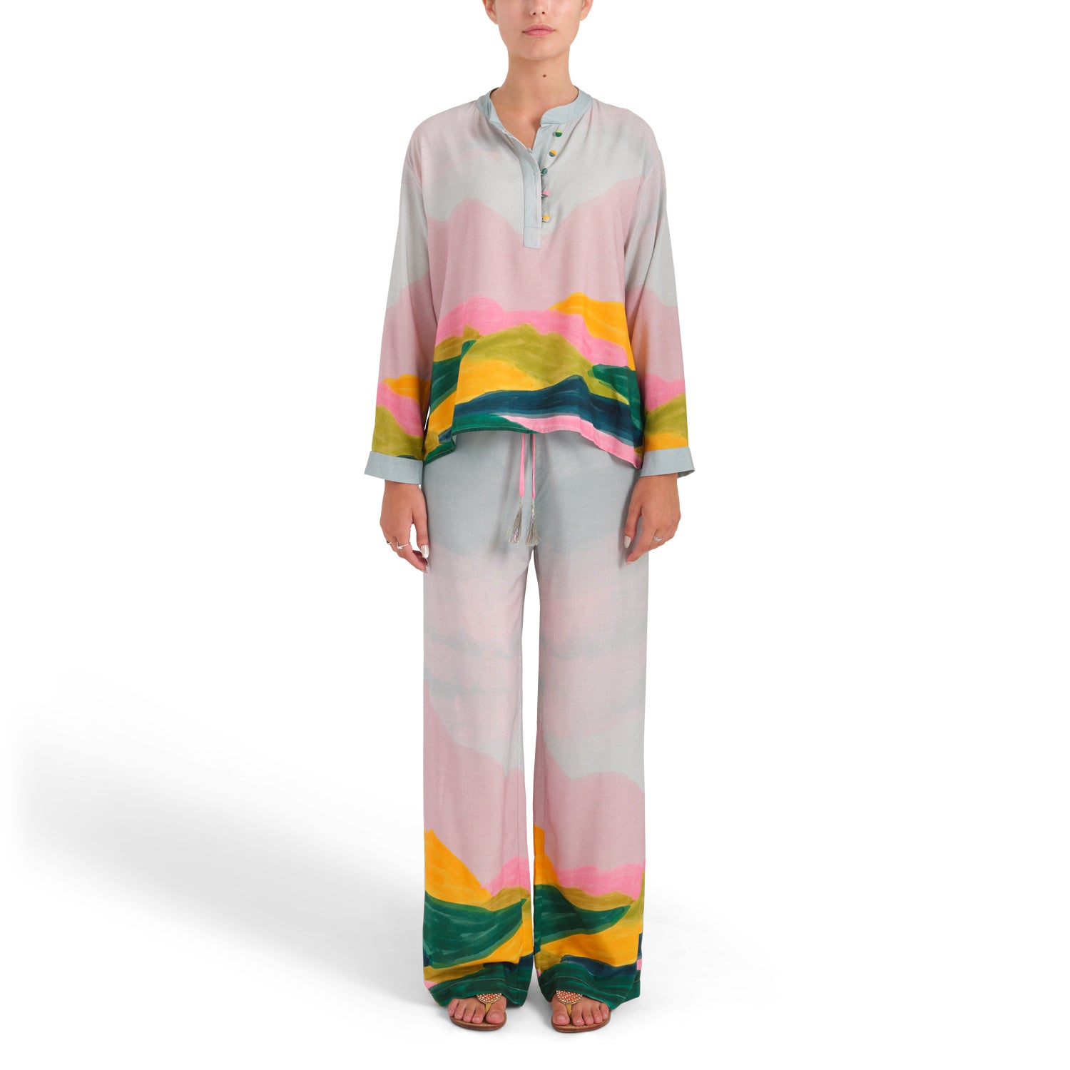 A quiet landscape on a raging colored sea, this relaxed and comfortable button front shirt is expertly crafted from a quality, wonderfully soft Ecovero (TM) viscose. Finished with matching fabric covered buttons, this shirt drapes beautifully, feels like butter on you and is better for the environment than standard viscose. Elegant, comfortable and versatile, you can wear Olivia with the matching Kristin drawstring pant beach hanging out by the pool with friends, for a spin around town or out for cocktails and dinner in the evening. She also pairs beautifully with neutral bottoms, like our Liory or Debbie in Law trousers.
