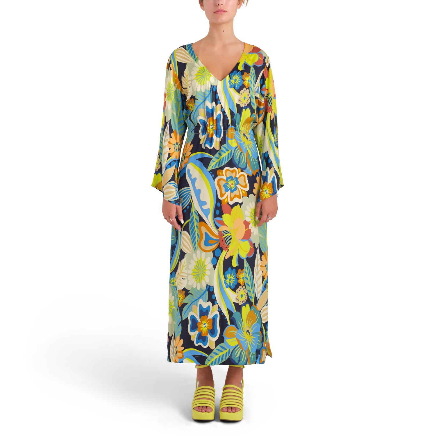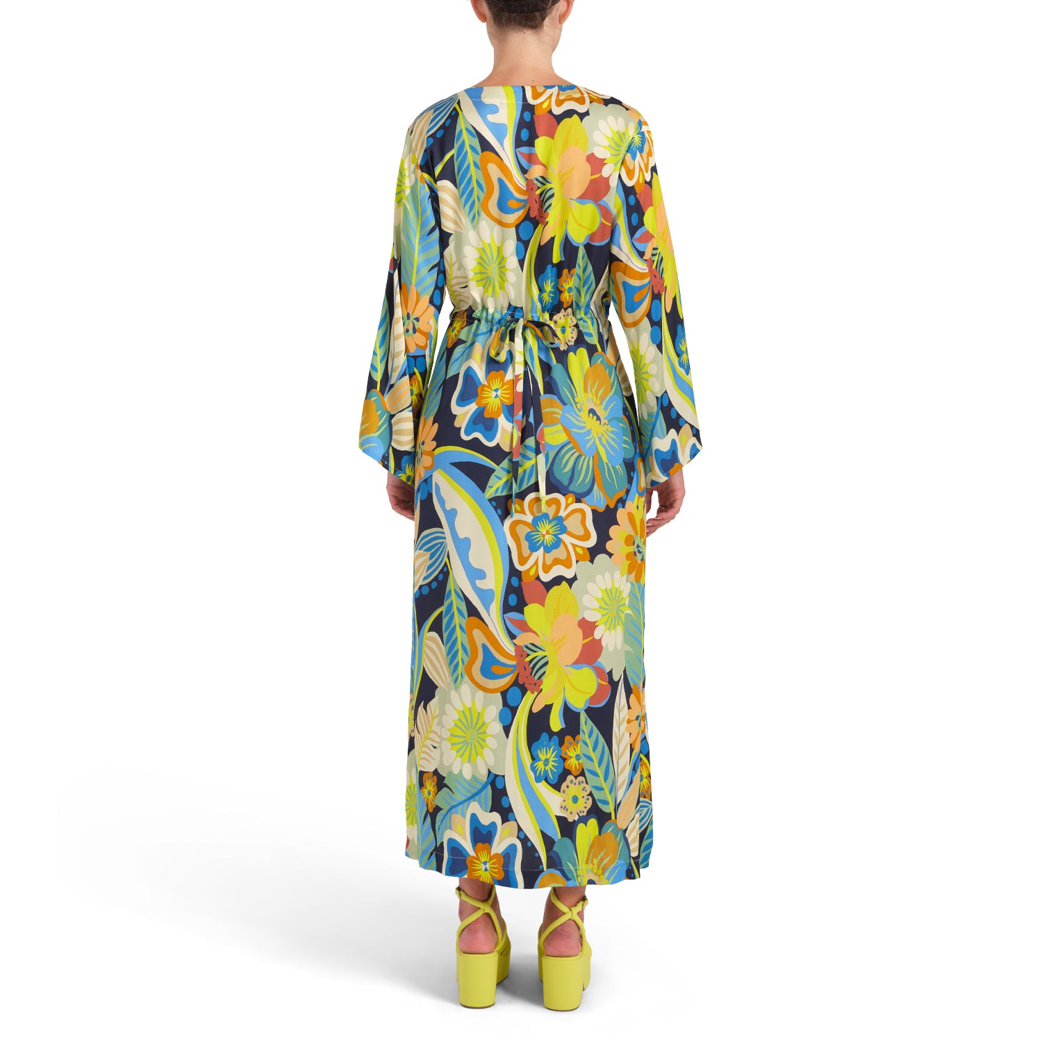 Our bestselling hooded kaftan reimagined as a elegant and luxuriously simple fitted kaftan dress with a V-neck and an adjustable ribbon waist that allows you to show your form as you see fit! The delicious bold print from Italy stands alone on this environmentally friendly, silky, ecovero (TM) viscose that drapes beautifully and feels like butter on your skin. Selma is topped off with pockets ensuring versatility and comfort accompanies elegance. Wear this beauty with lots of bangles and rings and if you're feeling like a Tiger that day or evening wrap up your hair in one of our ombre scarves.