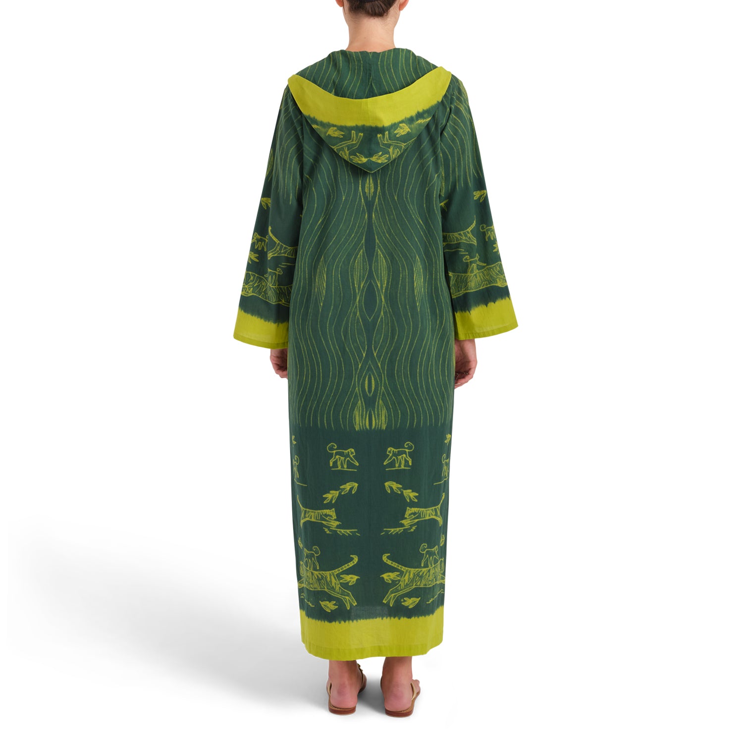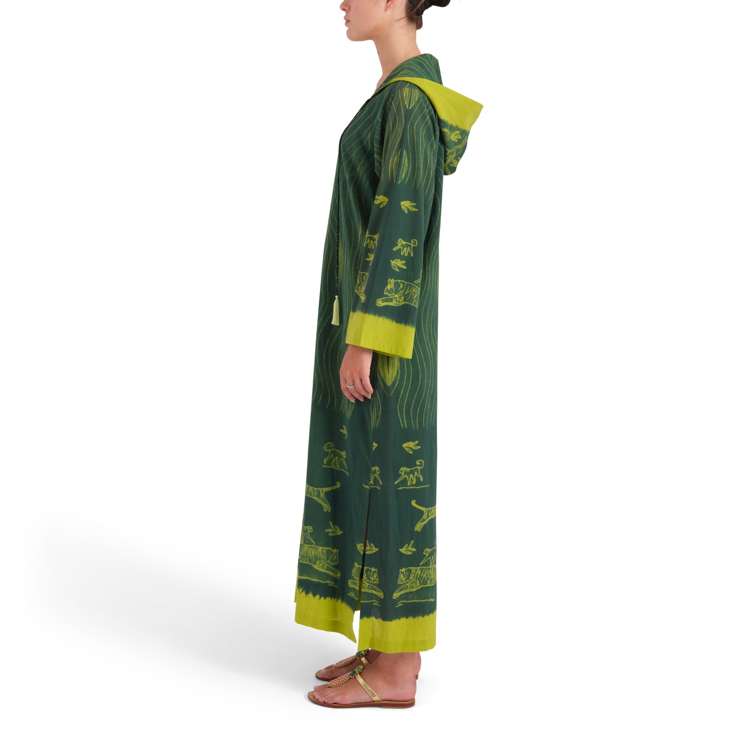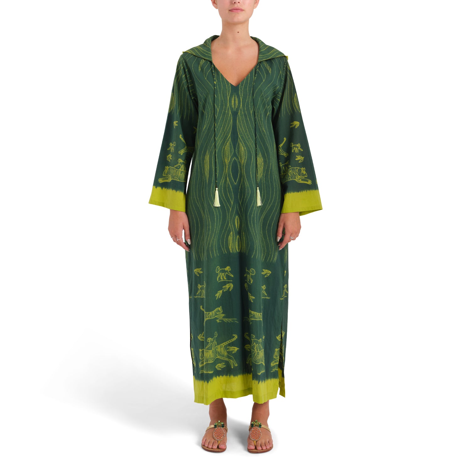 Radiant in color, stunning in design, our green and lime yellow hand loomed cotton kaftan is our exclusive hand worked shibori Tiger and Monkey print. Designed in collaboration with an award-winning artisan collective in India, no two pieces will be exactly alike making this your very own work of wearable art. Adorned with tassels and side pockets, this is the perfect piece for a casual stroll in your favorite coastal (or home) town or cocktails on the patio of a spiffy bistro.
